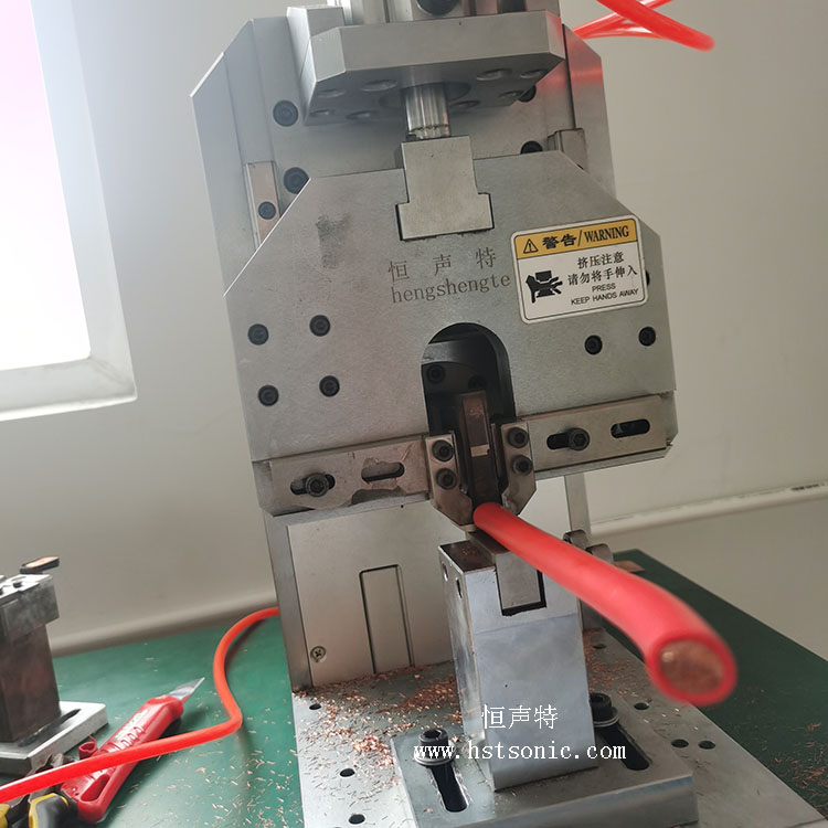 超聲波金屬焊接機設備操作簡單,將銅片放在下工裝處,在將電纜線放在銅片上面,定位,啟動按鈕,設備在設定好的參數(shù)下完成壓接。